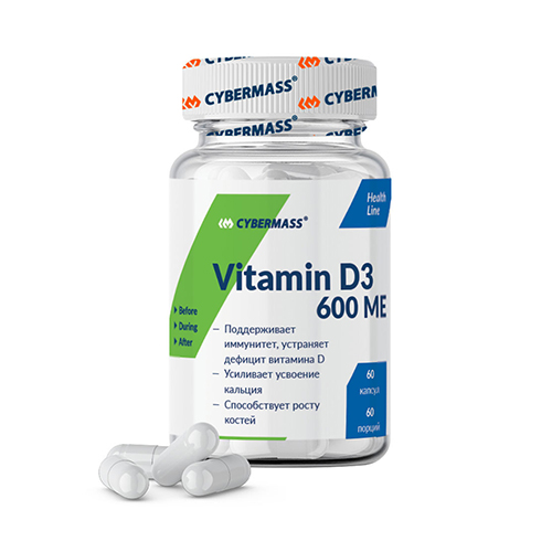 Cybermass Vitamin D3 способствует отложению кальция и фосфора в организме; Поддерживает здоровье зубов и костей; Нормализует функционирование нервной и опорно-двигательной системы; Почему стоит выбрать Cybermass Vitamin D3 Достаточное поступление витамина Д3 необходимо для поддержания здоровья опорно-двигательного аппарата; Холекальциферол вырабатывается в коже под воздействием ультрафиолетовых лучей; В небольшой концентрации содержится в продуктах питания; Задействован в синтезе половых гормонов, регуляции кальциевого обмена; Стимулирует деятельность иммунной системы; Интенсивная физическая нагрузка, возрастные изменения, избыточный вес, приводят к повышенной хрупкости костей, мышечной слабости; Необходимо ежедневно принимать витамин D3 в качестве пищевой добавки к основному рациону; Cybermass Vitamin D3 необходим для укрепления скелета и мышц; Улучшает усвоение кальция, магния и фосфора; Положительно влияет на состояние костей, связок и мышц; Повышает плотность мышечных волокон; Способствует укреплению зубной эмали; Предотвращает развитие кариеса; Поддерживает здоровье сердечно-сосудистой системы; Преимущества Способствует отложению кальция в костях; Устраняет дефицит витамина D; Снижает риск возникновения остеопороза, рахита; Поддерживает мышечный тонус; Способствует укреплению костно-мышечной ткани; Стимулирует защитные функции организма; Положительно влияет на обмен веществ;